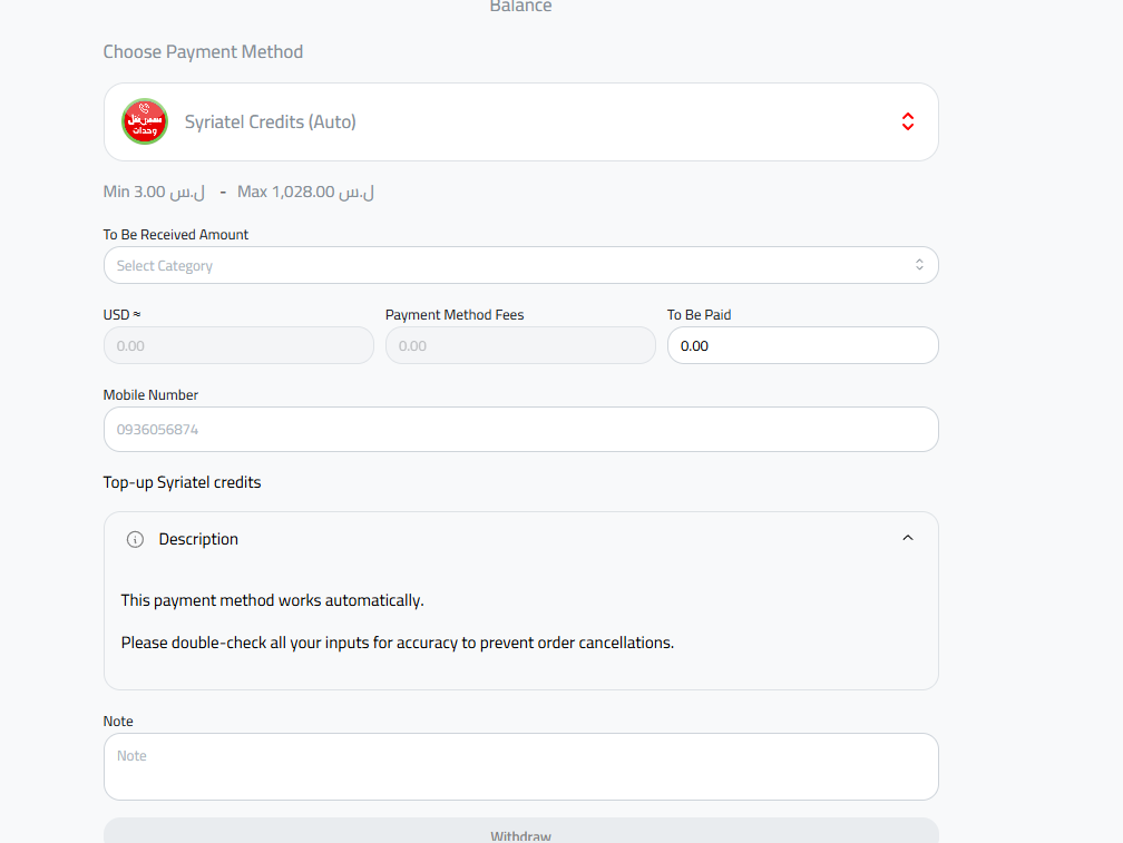 Please ensure all details are correct to avoid any order cancellations and ensure a smooth Withdraw Syrian Pounds via Syriatel Cash
